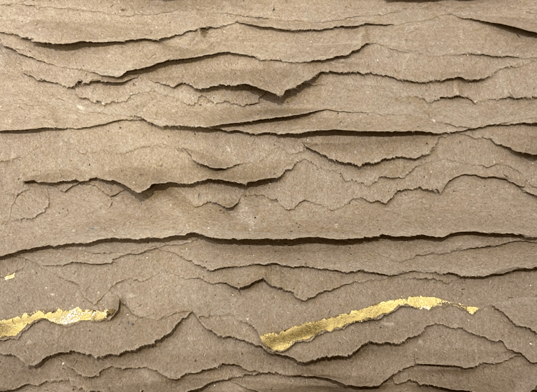 La lumière s’attarde sur les reliefs, révélant chaque volume, chaque déchirure. Un mince filet de feuille d’or, tel une cicatrice lumineuse, capte le regard. Fragile et discret, il devient pourtant le point d’ancrage de l’ensemble, comme une faille précieuse où se loge l’espérance.