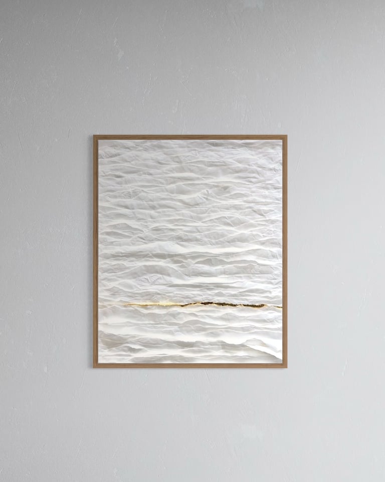 Light lingers on the reliefs, unveiling every fold and fracture. A thin line of gold leaf, like a luminous scar, captures the eye. Fragile and discreet, it nonetheless anchors the whole, a precious breach where hope finds refuge.