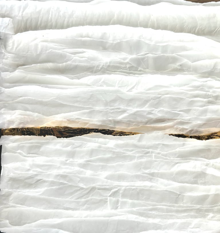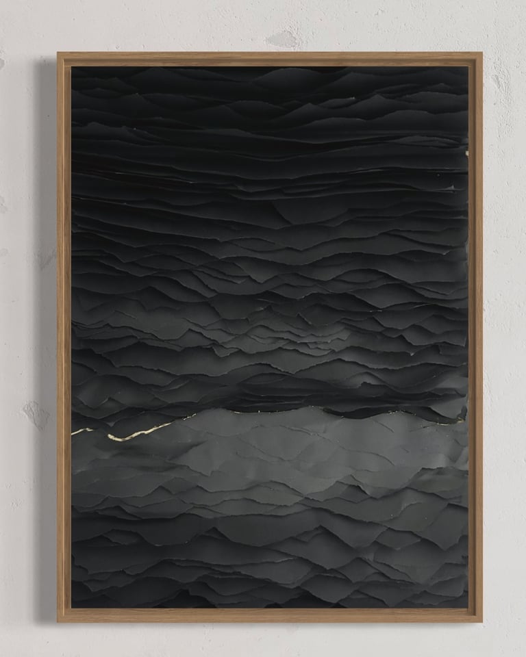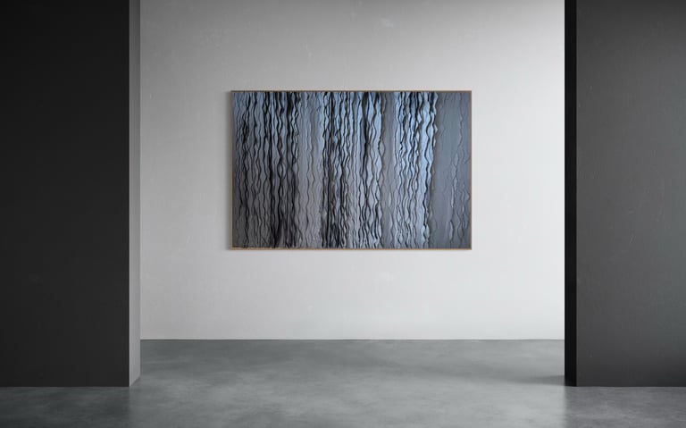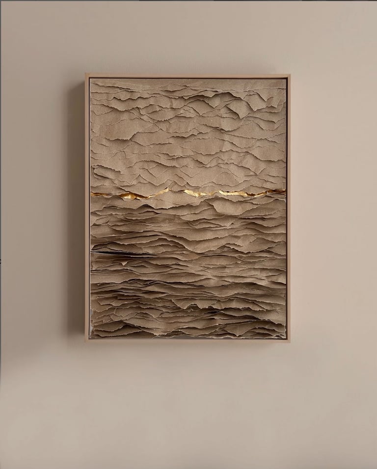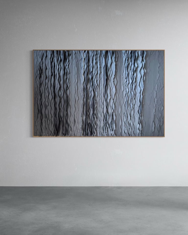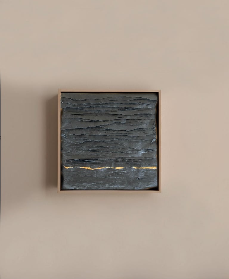 In this series, paper is worked tone on tone, patiently assembled until it becomes an enigmatic matter. At times it evokes reptilian skin, at others slate, depending on the chosen shades. From these layers emerges a mysterious surface, both organic and mineral.